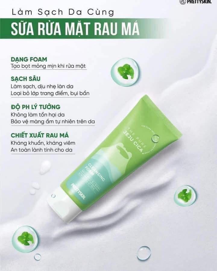 The Jeju Cica Prettyskin – Sữa rửa mặt chiết xuất rau má, kết hợp Tràm trà, Propolis và Glycerin, giúp làm sạch sâu, làm dịu da, kiểm soát dầu nhờn mà vẫn giữ ẩm tự nhiên, an toàn cho cả da nhạy cảm.
